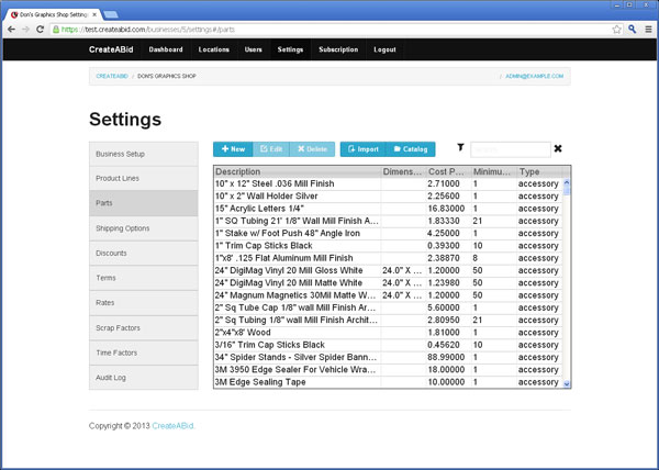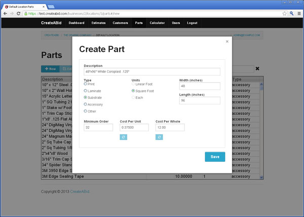 Quickly create parts on the fly and start using them immediately. Simply add a description, click how you will calculate the part, in linear feet or square feet, and add your cost. The part is now ready to be used in the system. You also have the ability to import parts from a csv file into the database. If you have a price increase in your cost you have the ability to edit the part cost for accurate estimating.