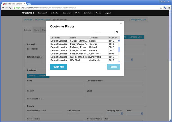 Quickly add a customer to an estimate from a searchable database. Add a customer on the fly, or import your customers from a csv file. All of your customer data will populate to the estimate screen for faster processing. Save notes on each customer in the database that will be visible each time you choose them.