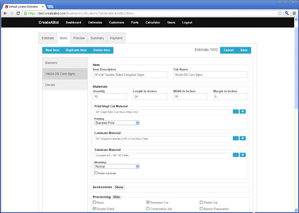 Create multiple items in an estimate with ease. You now have the flexibility to create an estimate with banners, decals die cut to shape, or real estate signs, without ever leaving the estimate screen. Not only can you create multiple items but you can edit the estimate later and see the exact material used. Each line item has its own functions making each one customizable. With quick viewing tabs on the left, you can quickly see how many items are on the estimate.